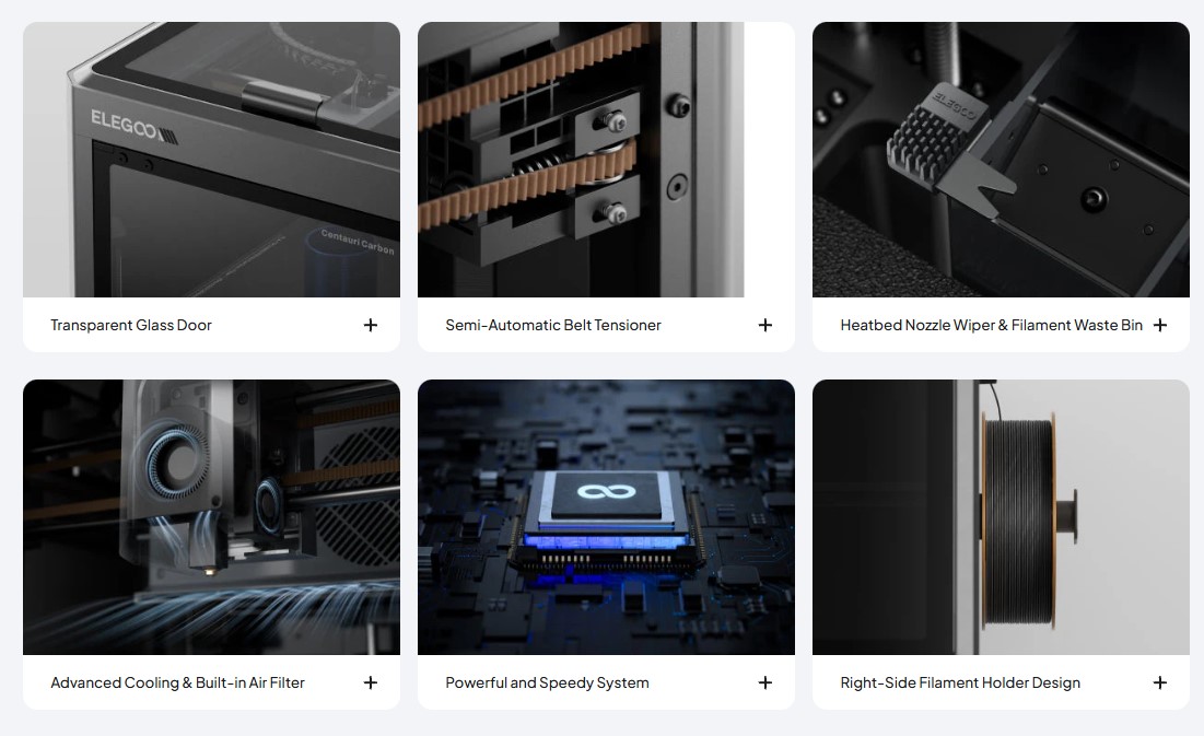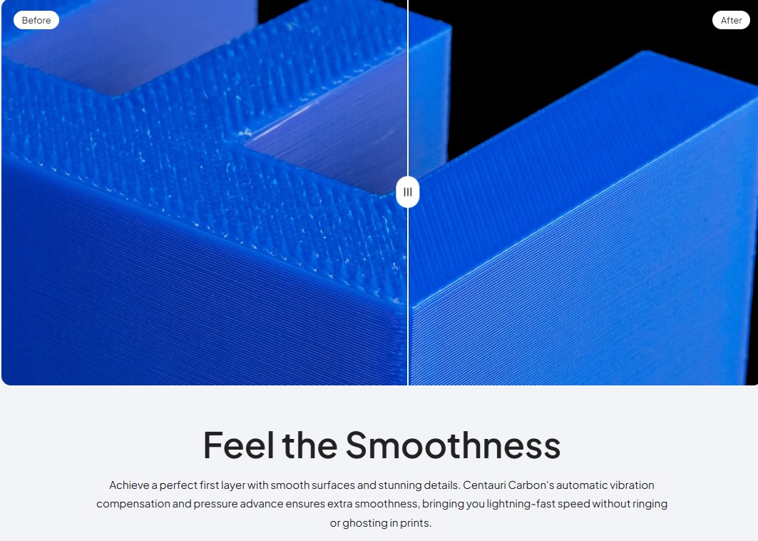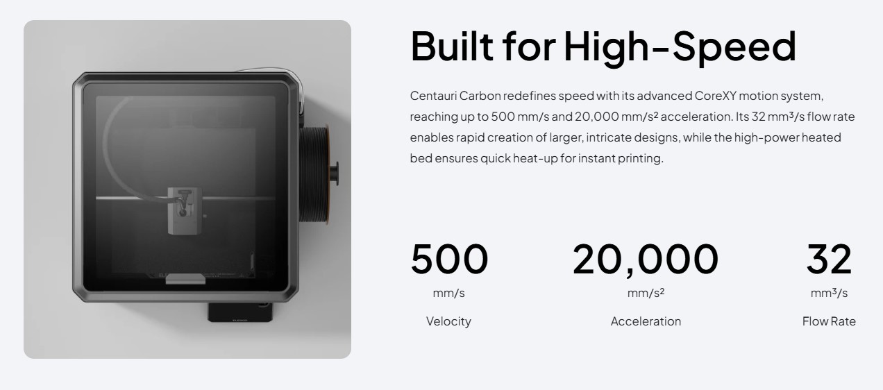 پرینتر Centauri Carbon از سیستم حرکتی CoreXY بهره میبرد که بهطور چشمگیری باعث افزایش سرعت و دقت میشود و میتواند تا 500 میلیمتر بر ثانیه سرعت چاپ و شتاب تا 20,000 میلیمتر بر ثانیه مربع را پشتیبانی کند. این ترکیب باعث میشود چاپ بزرگ و پیچیده در زمان کمتر و با کیفیت بالا انجام شود.
