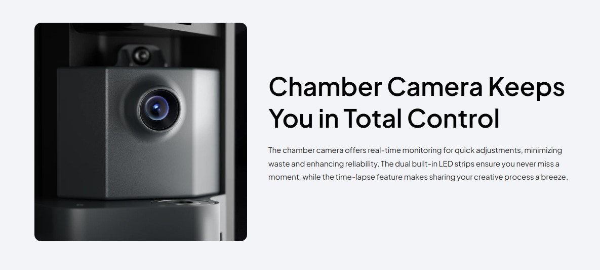 - دوربین داخل محفظه: امکان نظارت بر فرایند چاپ بهصورت لحظهای و ذخیره ویدیوهای Time-Lapse.