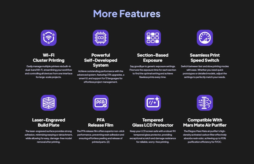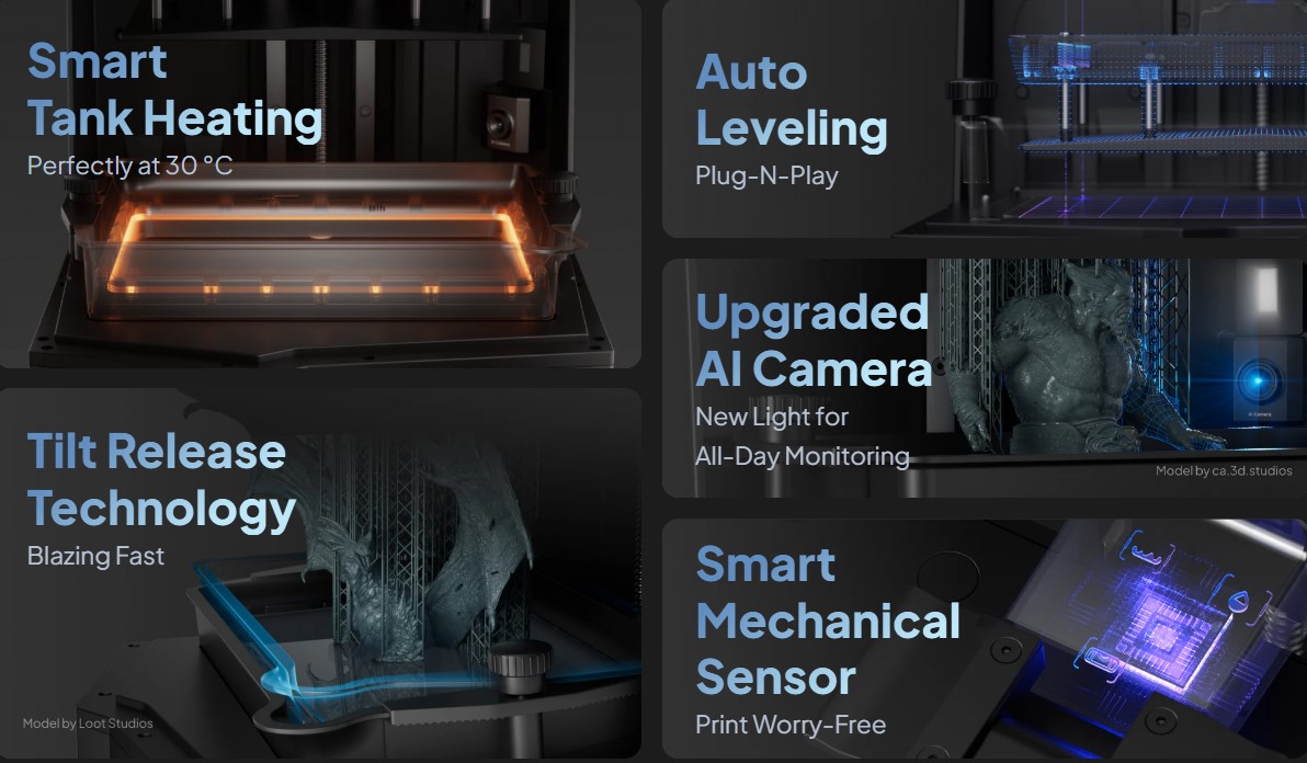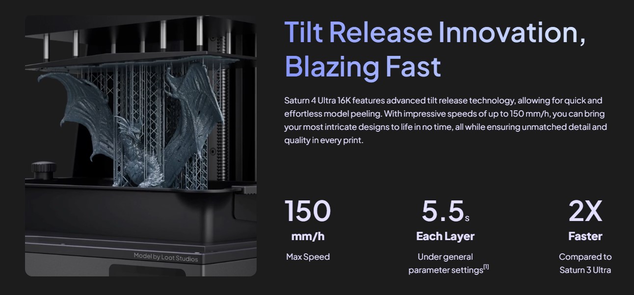 - حداکثر سرعت چاپ: تا 150 میلیمتر در ساعت با استفاده از Tilt Release Technology که جداکردن چاپ از فلیم را سریعتر و روانتر میکند.